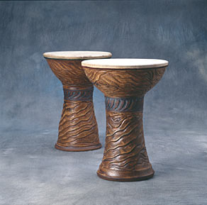 the drum heads are made of goat skin tightly stretched and glued to reduce the effects of humidity.